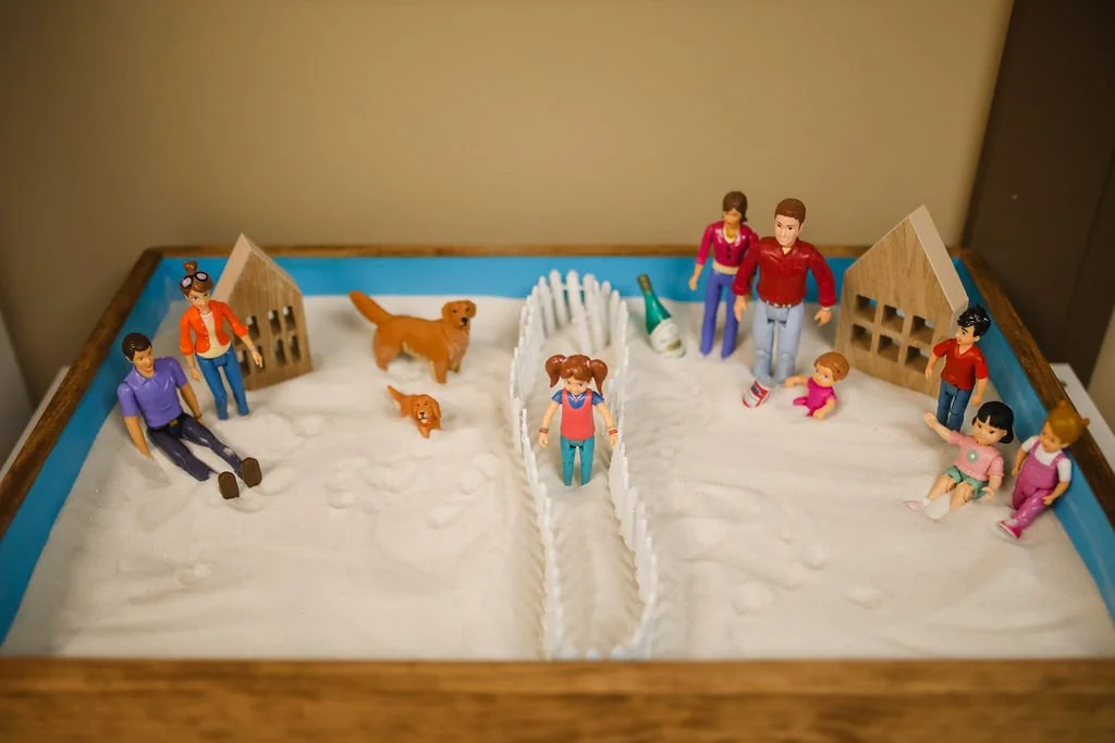 We use Sand Tray Therapy with children to process their experiences. This provides a fun and creative way to express thoughts and emotions. This is an effective way to treat our clients who have experienced trauma. The use of sand and placement of miniature figures is a unique kinesthetic process. It provides a safe sensory experience that can decrease anxieties and improve self-regulation.